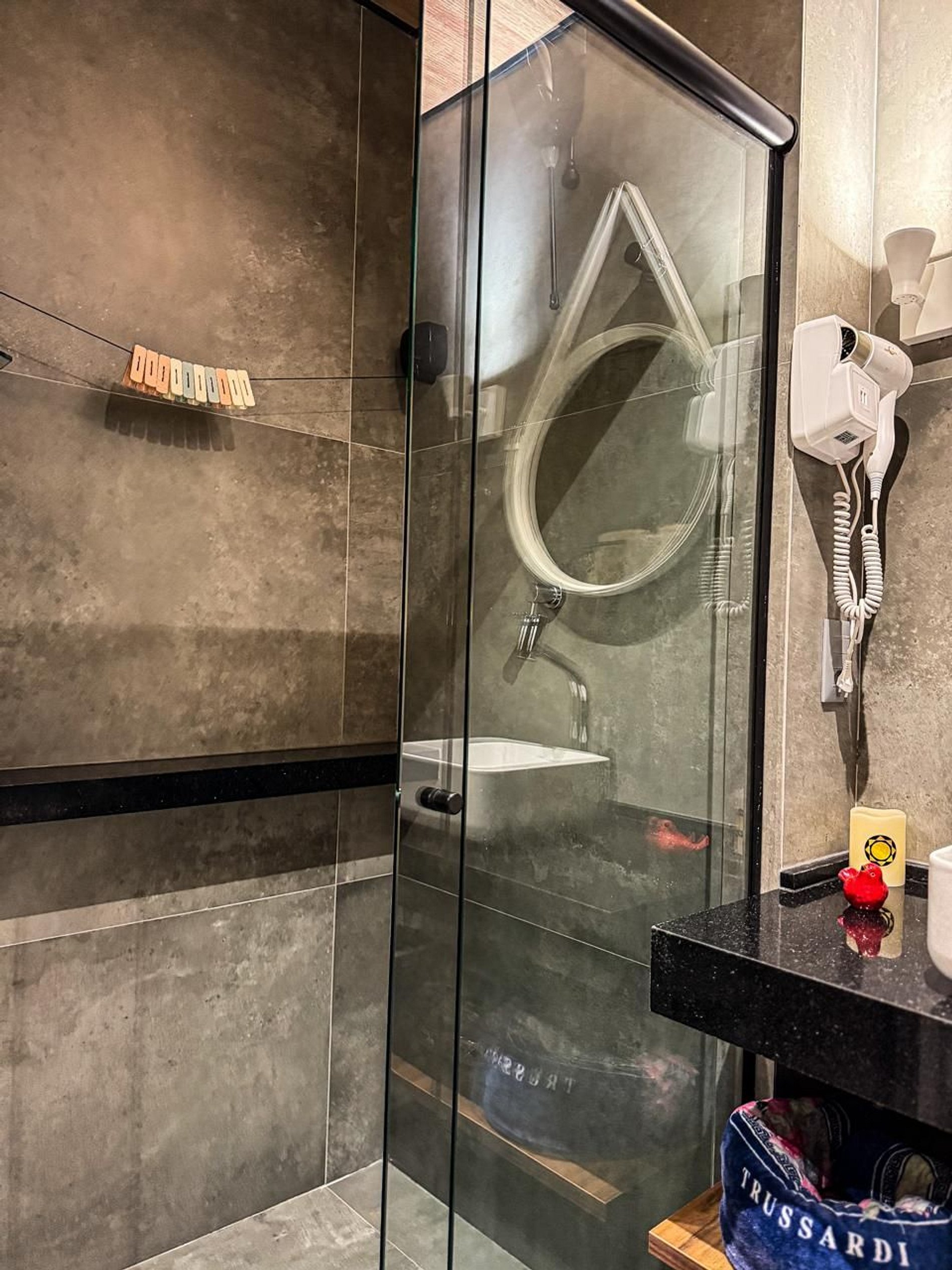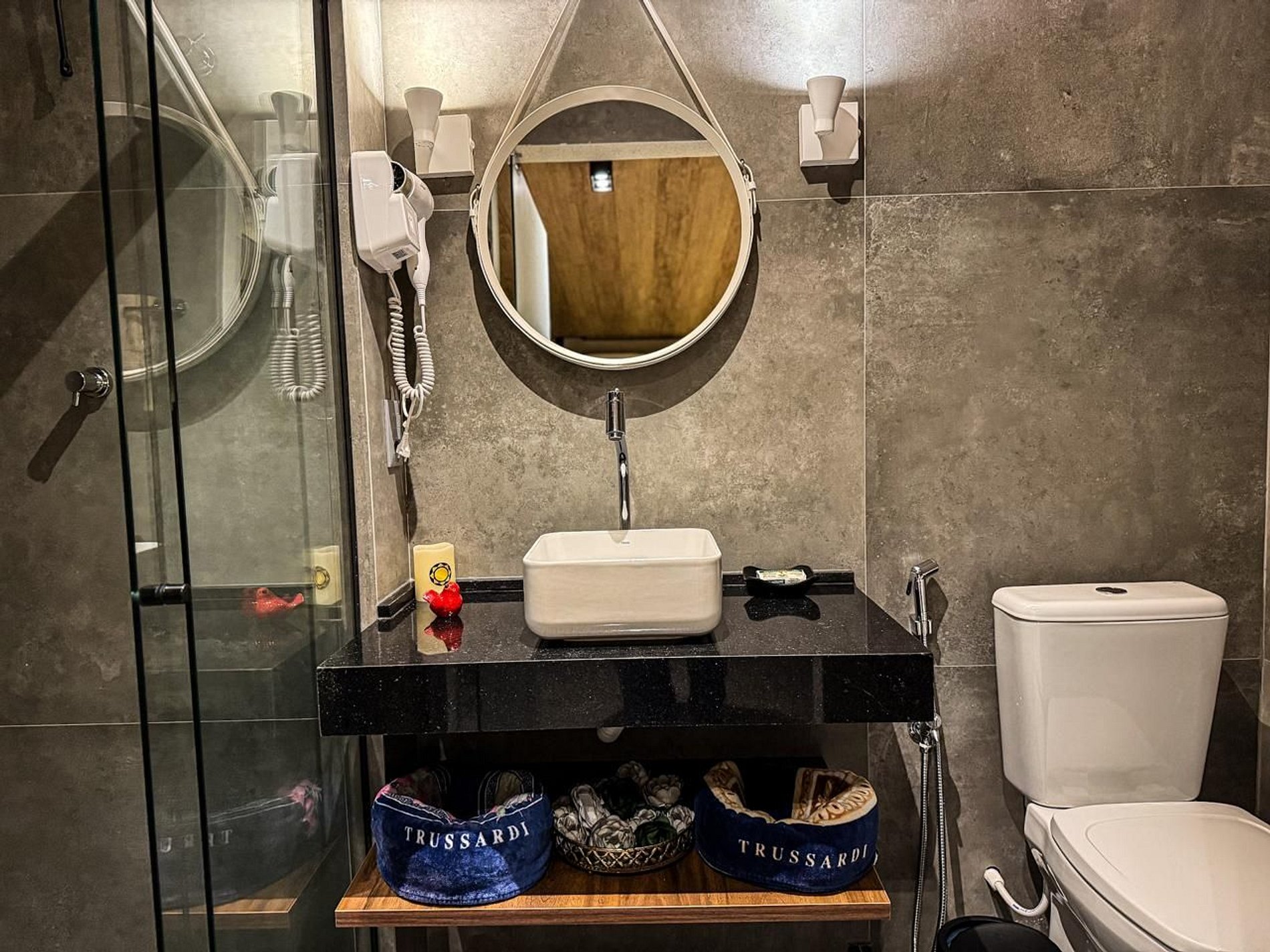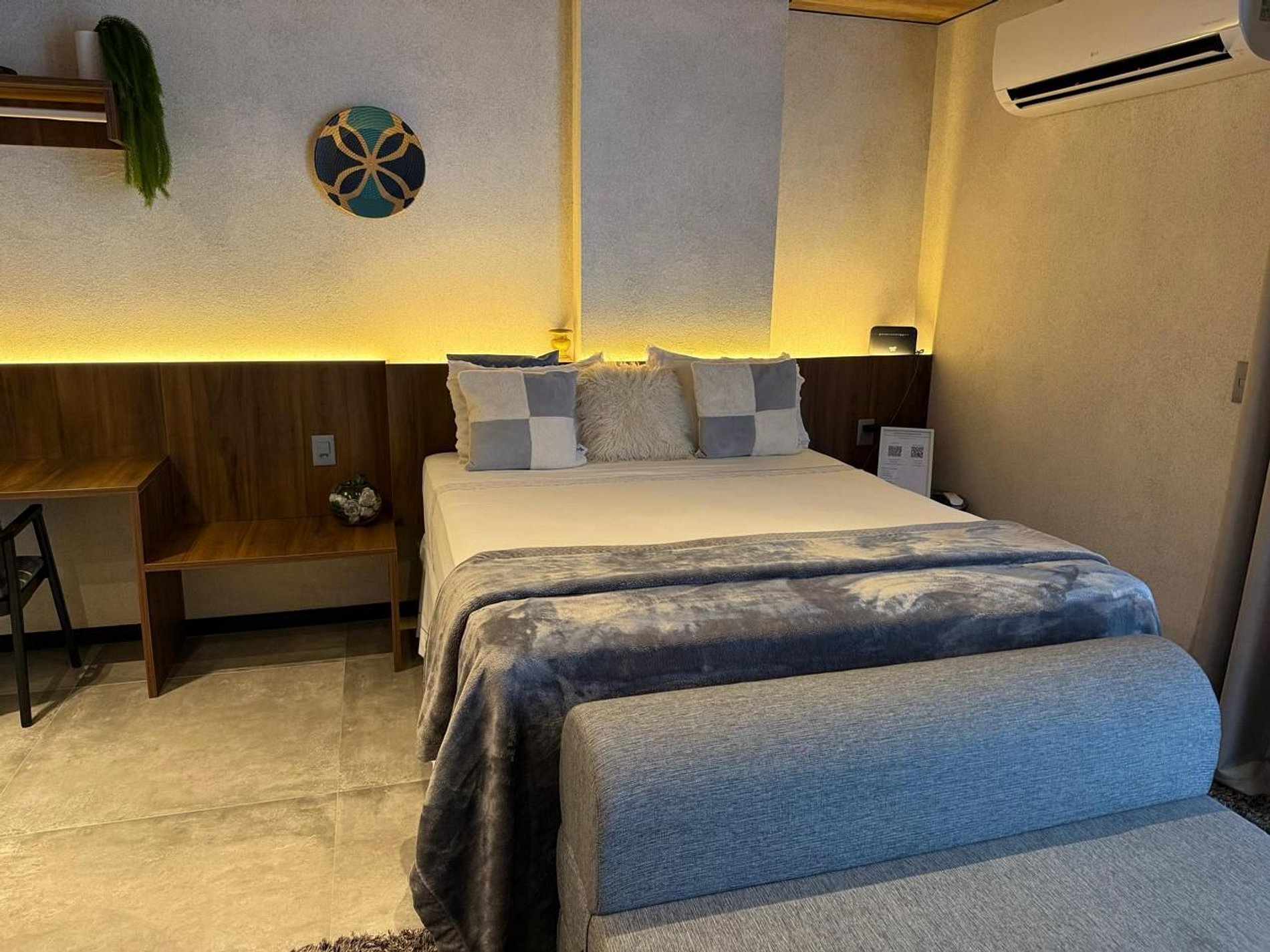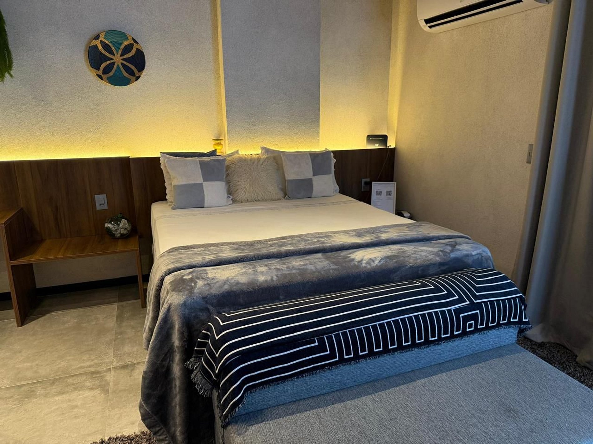 • Conforto Premium: Cama queen de alto padrão, travesseiros anatômicos e enxoval de luxo da marca Trussardi.