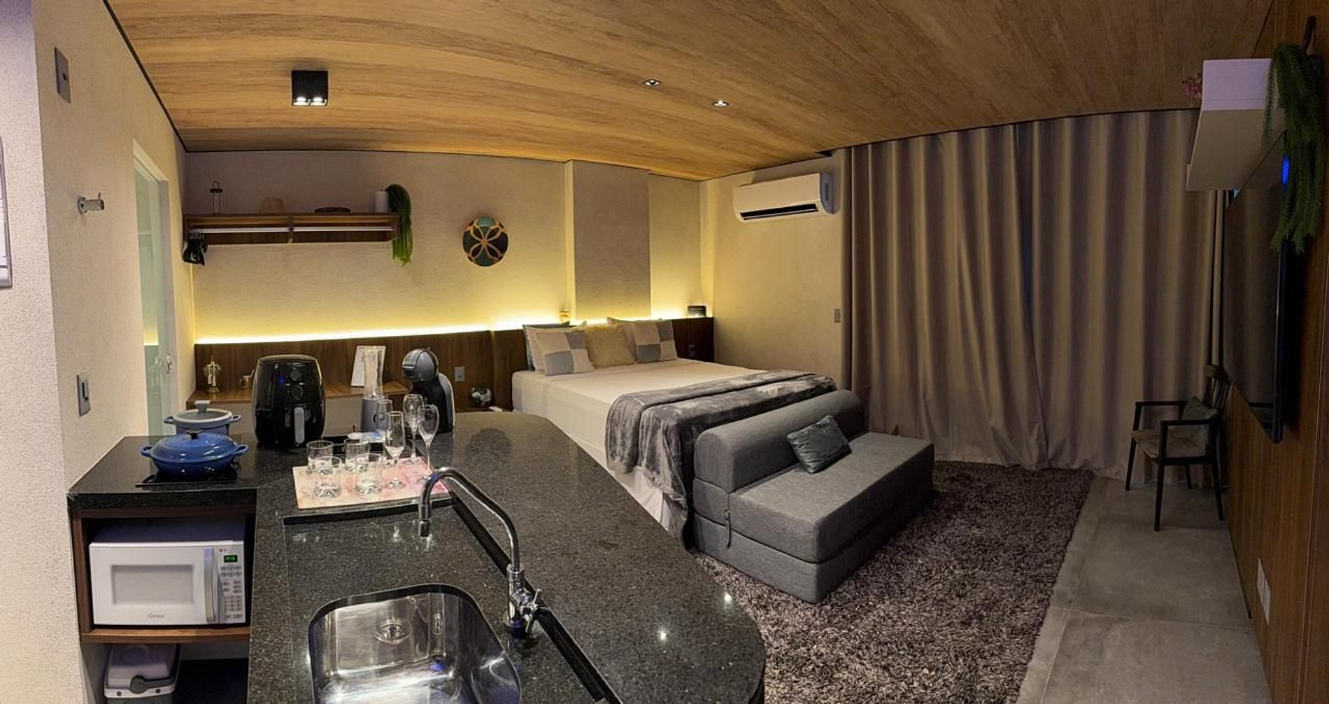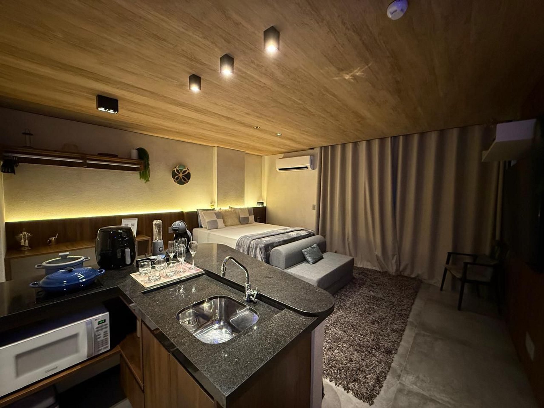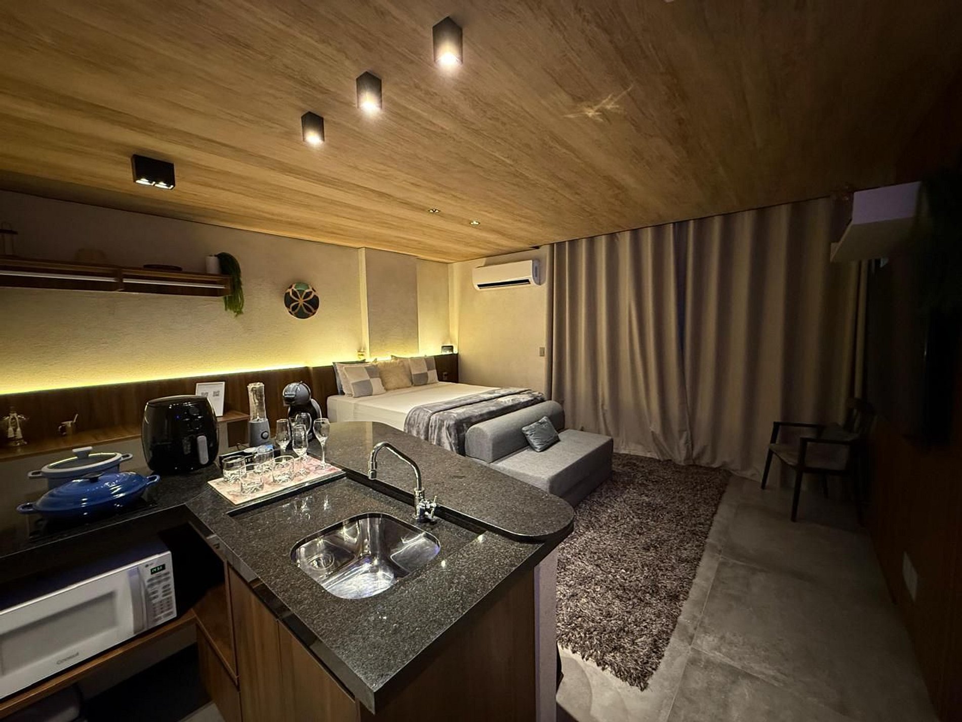 • Cozinha Compacta e Completa: Equipada com cafeteira Dolce Gusto, sanduicheira, air fryer, liquidificador e utensílios essenciais para refeições rápidas e práticas.